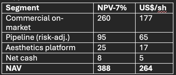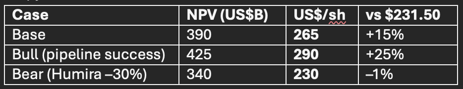 Price Targets: US$265 (DCF) | US$270 (NAV) | US$275 (SOTP) | Down-side US$200 (Humira cliff > 35%) | Blue-sky US$290 (pipeline acceleration)