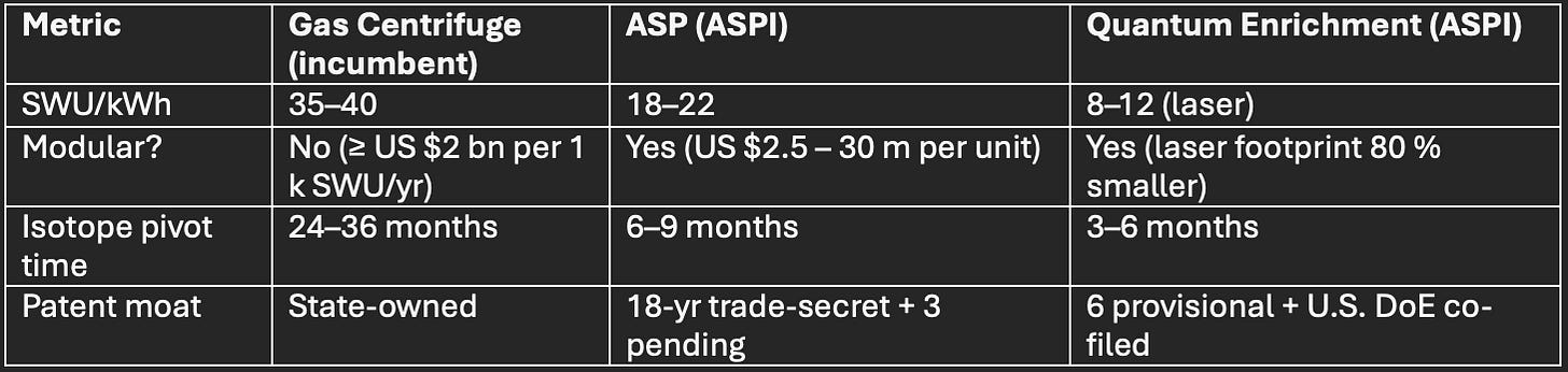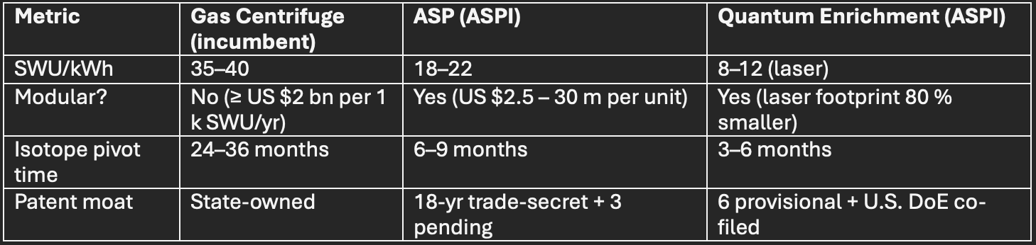 Take-away: ASP gives ASPI speed-to-cash (first revenue Carbon-14 already contracted); QE gives asymmetric upside (HALEU, Yb-176, Ni-64). Competitors need > US $1 bn and 7–10 years to replicate; ASPI can stack 5–10 modules per year for < US $200 m total.