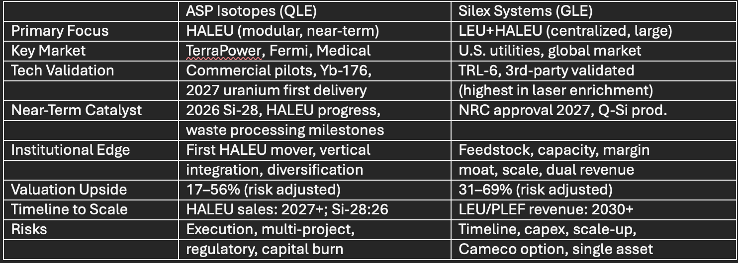 This sector is in a unique multi-decade growth window in which both ASP Isotopes and Silex Systems are set to be core winners. A blended exposure captures differentiated technology, commercialization timelines, and market risk profiles for optimal risk-adjusted growth and structural defensiveness in the global energy transition.