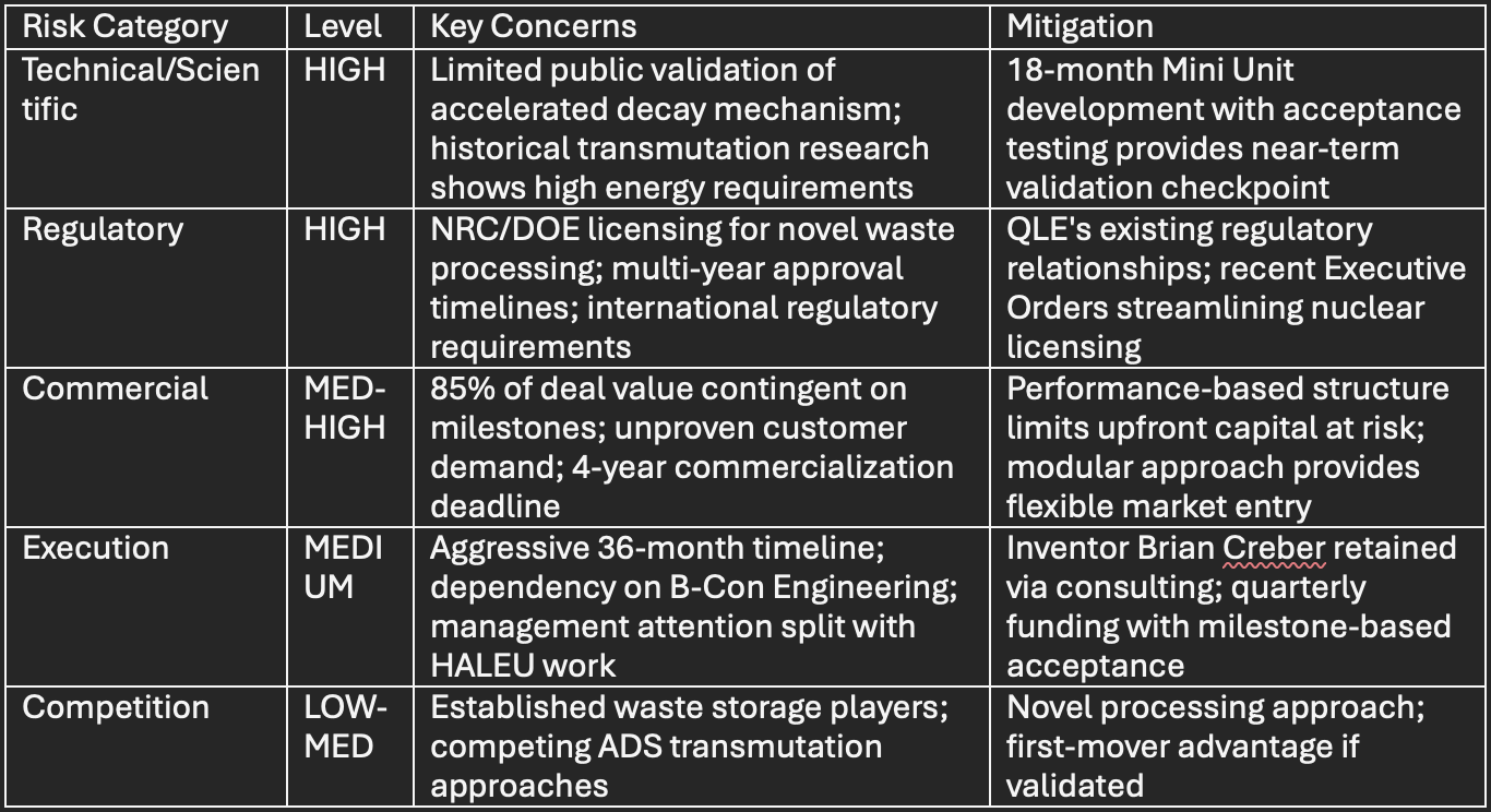 Recommendation: Monitor Mini Unit development closely over next 18 months as key determinant of acquisition value. The intersection of nuclear waste remediation and quantum computing materials represents a genuinely novel business model that could differentiate QLE if successfully executed. However, significant technical, regulatory, and commercial validation required before material revenue contribution.