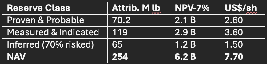 Assumptions: 2.5 M lb pa 2027-32, AISC US$26.5, capex US$650 M, mill toll 10%.