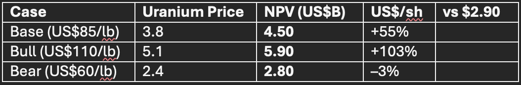 Price Targets: US$4.20 (NAV) | US$4.50 (DCF) | US$4.80 (SOTP) | Down-side US$2.10 (U < $60/lb or permitting delay) | Blue-sky US$6.00 (Phoenix first pour + refinery option)