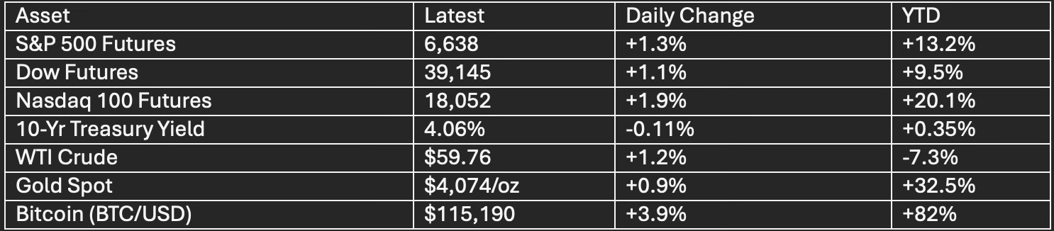 U.S. equity futures rebounded sharply premarket Monday as trade tensions cooled. The S&P 500 closed Friday at 6,552.51, down 2.7% for the day in its steepest loss since April, but futures are now rising +1.3%, with the Dow up 1.1% and Nasdaq futures up 1.9%, reflecting renewed risk appetite after President Trump softened tariff rhetoric on China. Markets had whipsawed last week following the 100% China tariff threat, but a diplomatic turn over the weekend stabilized sentiment.