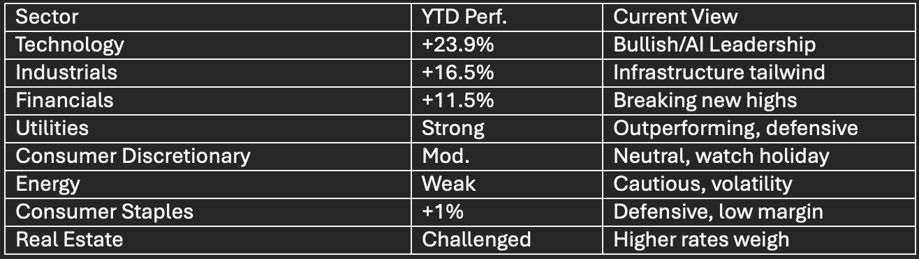 Financials/Industrials: Strength continues; benefiting from lending, defense, and energy infrastructure.