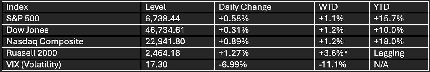 *Russell 2000 outperforming on rotation; small-cap rally continues.