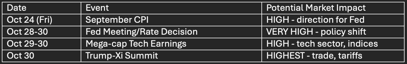Key Global Events: Trump-Xi meeting scheduled Oct 30. Trade tariff escalation remains a wildcard for volatility.