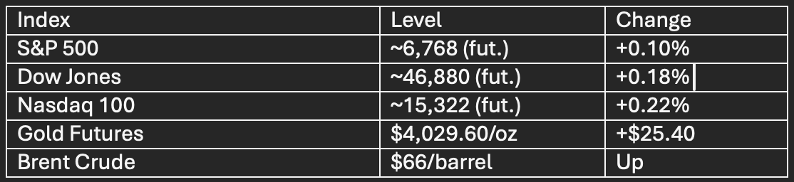 U.S. equity markets are navigating mixed signals amid ongoing government shutdown and anticipation for the Federal Reserve’s September meeting minutes, now due later today. Overnight, futures inched higher after Tuesday’s declines, with the S&P 500, Dow, and Nasdaq futures each up about 0.2% in early pre-market action, maintaining proximity to record highs despite volatility tied to tech sector profit warnings and AI bubble concerns, notably Oracle’s cloud margin disappointment.