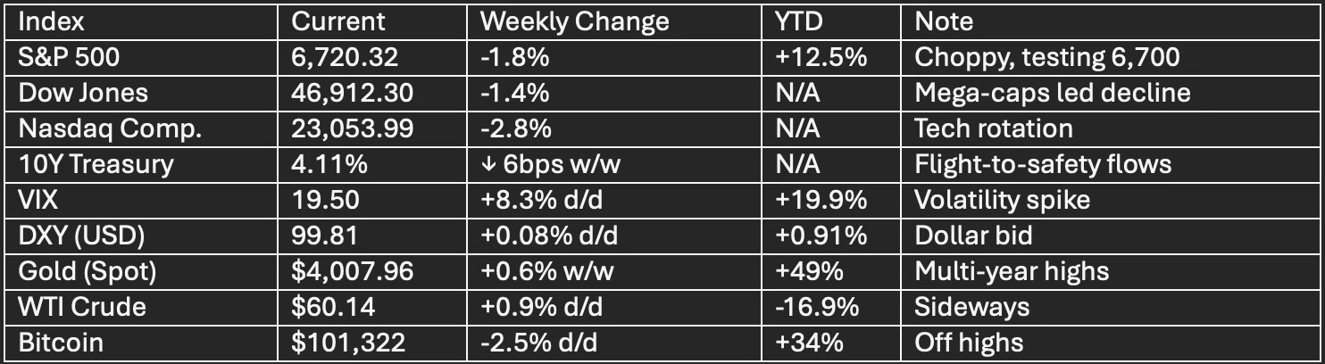 Indices: Broad selloff led by tech; Nasdaq -2.8% on the week. S&P 500 trades below key moving averages, breadth remains weak (only 37.8% above 20-day MA).