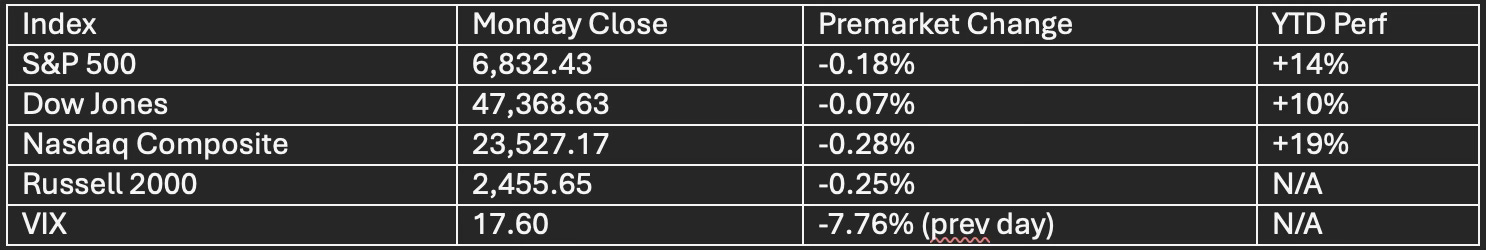 Nasdaq logged best day since May (+2.27%), led by AI; futures soft premarket Tuesday as traders book profits.