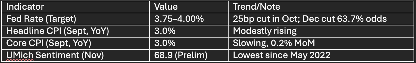 FOMC remains divided. Next cut expected December pending data post-shutdown. GDP upgraded to 1.5% 2025 (Nuveen), but forward risk focus on consumer and labor softening.