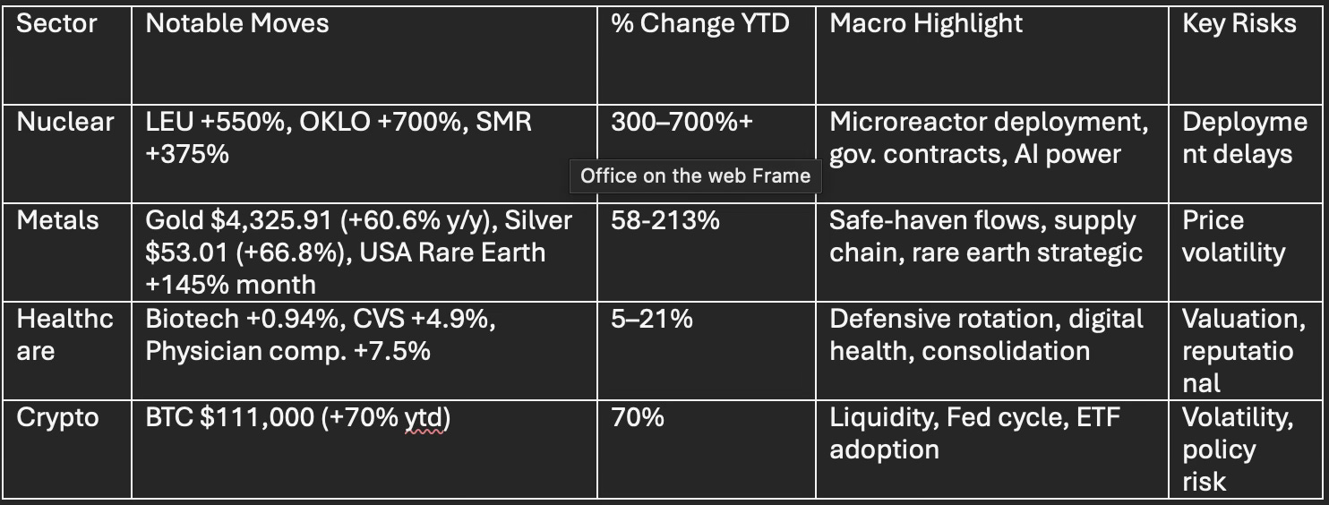 October 16, 2025 was marked by exceptional market volatility, with investors rotating into safe-haven assets, record highs in precious metals, and sector-specific dynamics driven by evolving macro, policy, and liquidity conditions. The nuclear energy, healthcare, metals, and crypto segments all delivered significant developments, making today a pivotal session for sector rotation and advanced portfolio positioning.