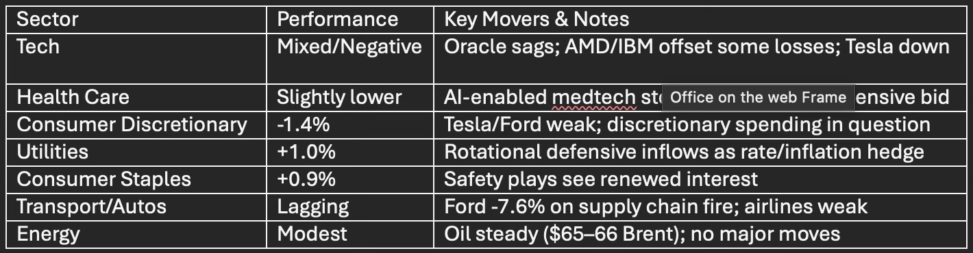 The overall sector breadth shifted defensive, with Utilities and Consumer Staples advancing, while cyclicals, tech (ex-AI), and consumer discretionary led on the downside.