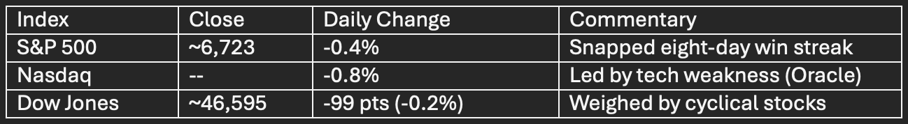 The S&P 500 experienced its first daily decline after eight positive sessions, shedding ~0.4% as Oracle’s >5% tumble and sliding cyclical names led the retreat.