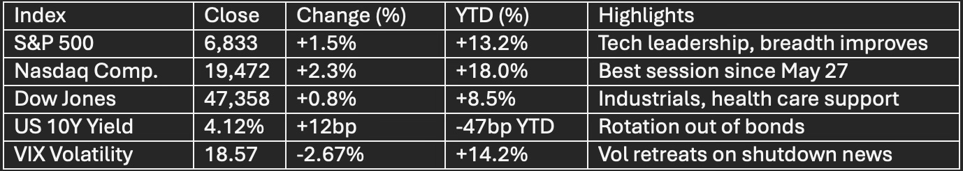 Drivers: China resource export pause, shutdown relief“Magnificent Seven”: Strong recovery; MSFT +0.8%, AAPL +1.8%, TSLA +3.99%