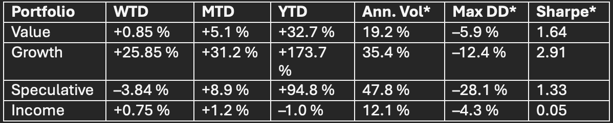 (All performance data are model returns; live client portfolios may differ slightly due to timing/cash-flows.)
