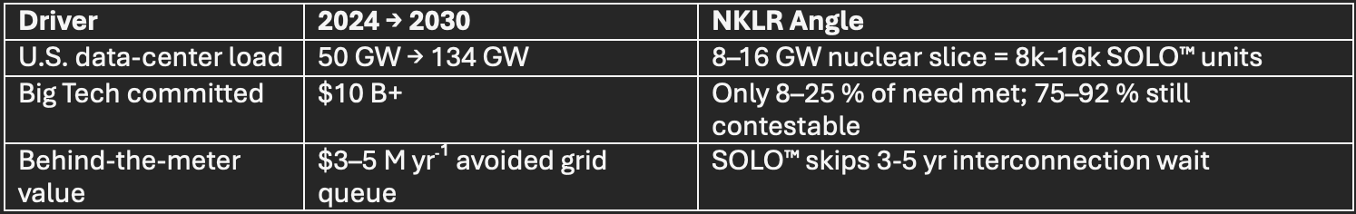 NKLR is the only publicly-traded micro-reactor developer that can deliver 1 MWe “behind-the-meter” units by 2027 using low-enriched uranium (LEU) already available today, skipping the 3-5 yr HALEU choke-point that stalls Oklo, X-Energy, BWXT.