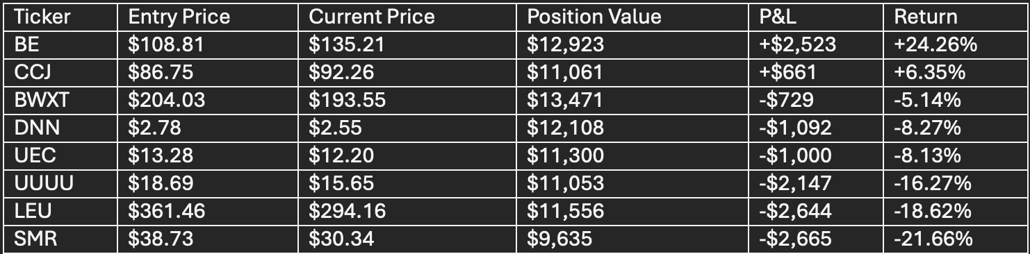 The Moderate Risk portfolio underperformed, driven by steep losses in nuclear fuel and SMR exposures. Centrus and NuScale faced intense selling pressure, while Bloom Energy provided critical upside ballast.