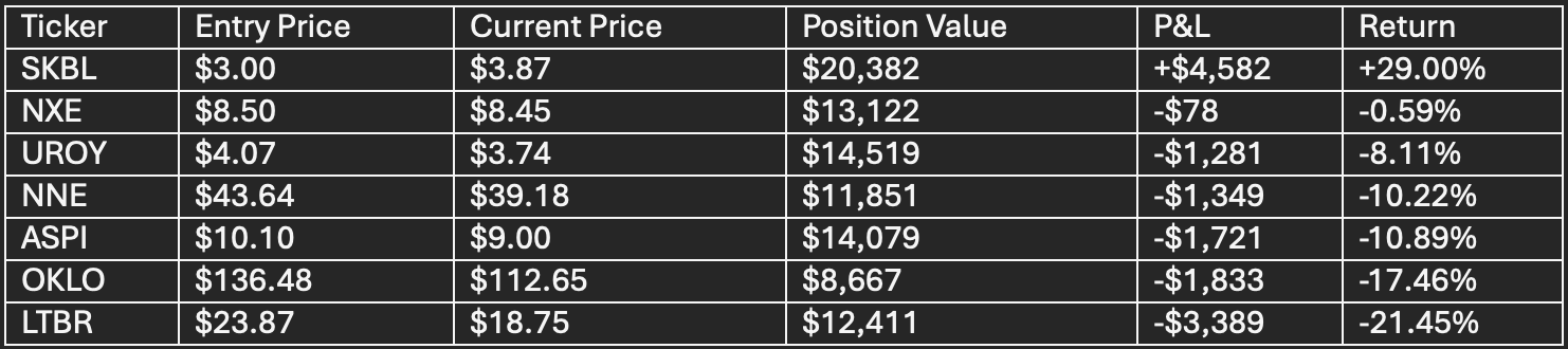 The High Risk portfolio declined 5.06% as speculative microcap and pre-revenue names absorbed the brunt of sector rotation. SKBL delivered exceptional gains on SPAC-related speculation, while uranium juniors and advanced reactor developers faced sharp selloffs.