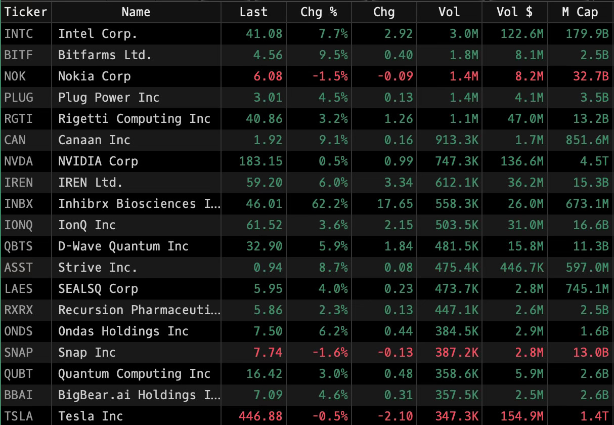 ================================================================ 5. TECHNICAL LEVELS (15-min VWAP) INTC 39.0 42.0 +2.88 43.5 BITF 4.20 4.80 +0.39 5.20 CAN 1.80 2.00 +0.16 2.10 RGTI 38.0 42.0 +1.28 44.0 IREN 56.0 62.0 +3.34 65.0 PLUG 2.90 3.20 +0.13 3.40