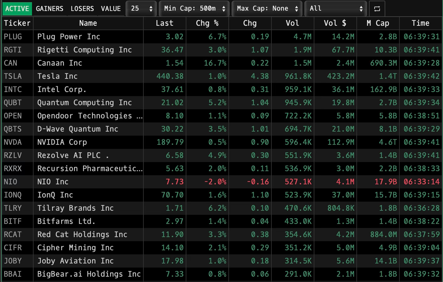 QUBT 21.02 +1.9σ 0.29 15% -28 +6.0 21.5 calls 2.1k sweep; delta-hedge flow ≈ 1.2 m shares