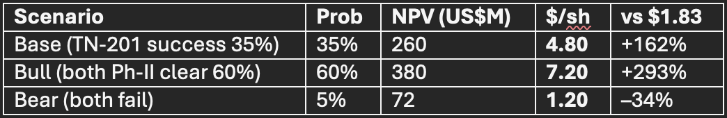 Phase-II failure scenario: NPV $72 M → $1.20/sh – still above cash value due to platform option.