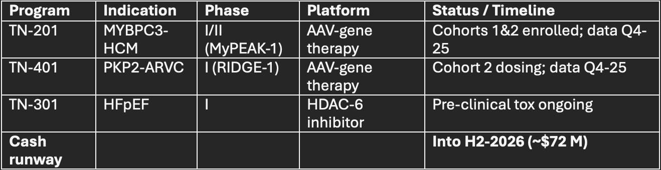 Core Gene-Therapy Bucket (15% weight): TNYA’s binary Phase-II catalysts = high-beta exposure to orphan-cardiology market.
