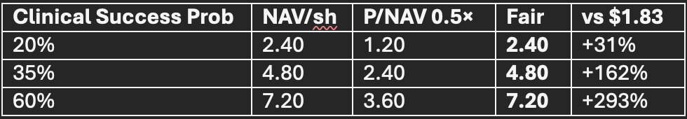 Q1-26: End-of-Phase-II meetings / FDA SPA – +US$1.20/sh on regulatory green-light.