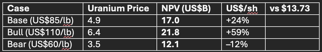 Price Targets: US$17 (DCF) | US$18 (NAV) | US$19 (SOTP) | Down-side US$9 (U < $60/lb) | Blue-sky US$22 (U > $110/lb + refinery FID)