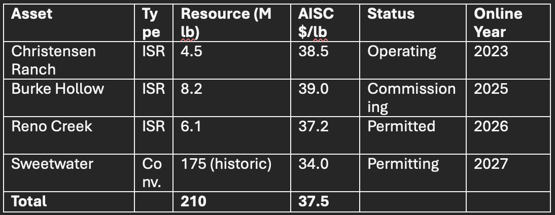 Balance-sheet torque: US$321 M cash + 1.36 M lb U₃O₈ inventory @ spot US$84/lb = US$435 M liquid assets – zero debt, negative EV until capex accelerates.