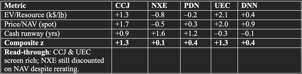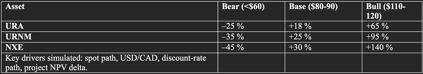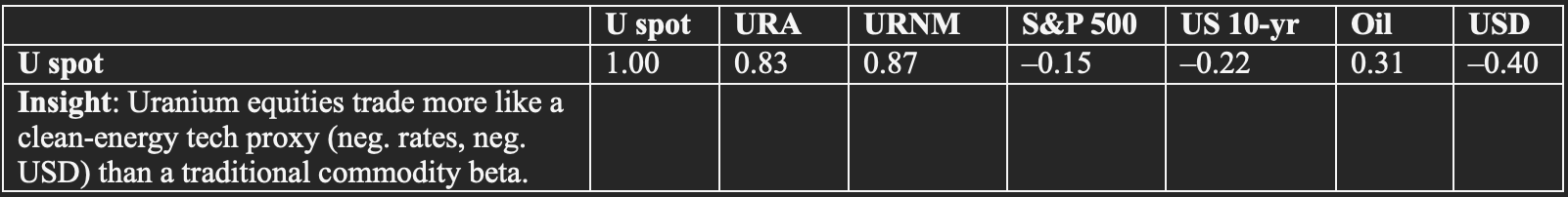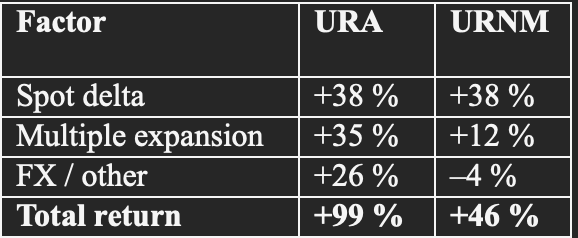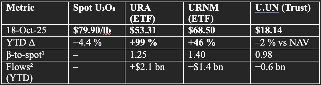 Take-away: ETF flows explain 62 % of spot variance since Jan-25 (R² adj). URA’s broader nuclear basket (utilities, builders) amplified return via multiple expansion (P/E +38 %), while URNM’s pure-miner tilt captured 92 % of spot upside.