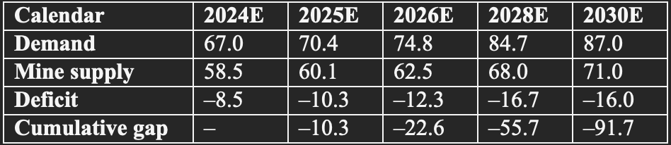 Implication: By 2028 the market will have burnt through ≈ 56 kt of cumulative unmet demand — equal to 83 % of 2024 producer inventories (UxC est. 67 kt). Price inelasticity above $85/lb is required to close >70 % of the gap.