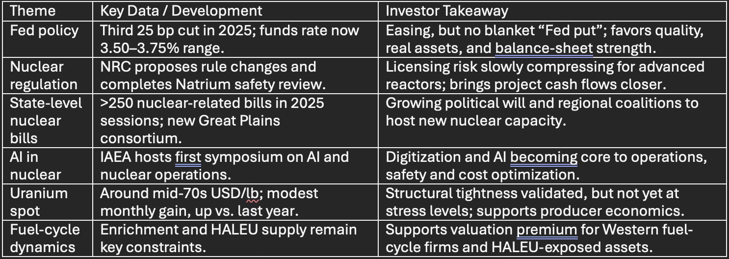 Internationally, the IAEA hosted its first dedicated symposium on AI and nuclear energy in early December, highlighting how analytics and automation are moving from the periphery to the core of plant operations, safety monitoring and fuel‑cycle optimization. For the SEQH nuclear complex, reactor OEMs, SMR developers, enrichment and isotopes, and nuclear‑levered utilities, this combination of regulatory streamlining, state‑level siting support and digitalization is steadily de‑risking timelines and expanding the addressable project pipeline.